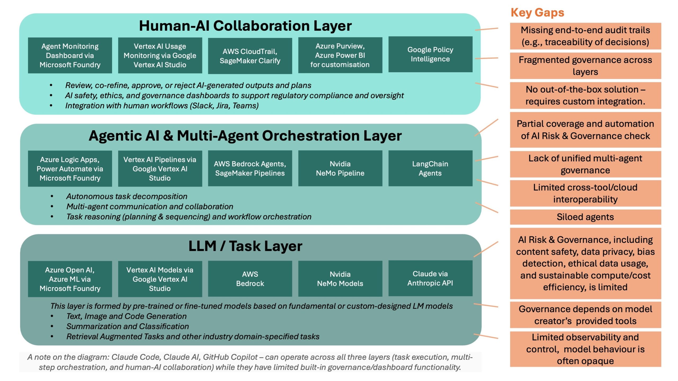At the architectural level, enterprise-scale Generative AI today generally have 3 core layers: LLM/Task Layers, Agentic AI and Multi-Agent Orchestration Layer and Human-AI Collaboration Layer.